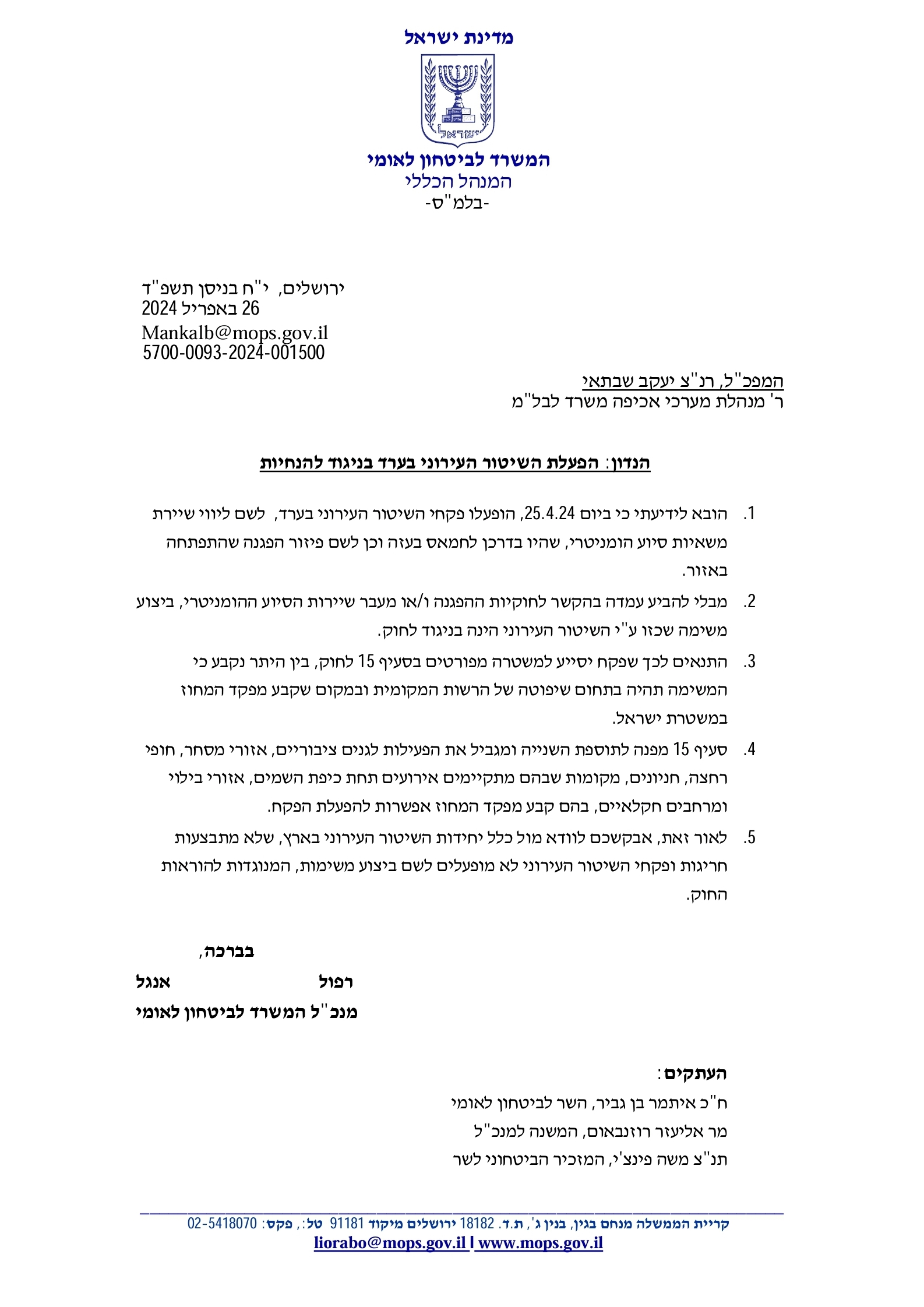 ״לאור זאת״, חתם אנגל, ״אבקשכם לוודא מול כלל יחידות השיטור העירוני בארץ שלא מתבצעות חריגות ופקחי השיטור העירוני לא מופעלים לשם ביצוע משימות המנוגדות להוראות החוק״.