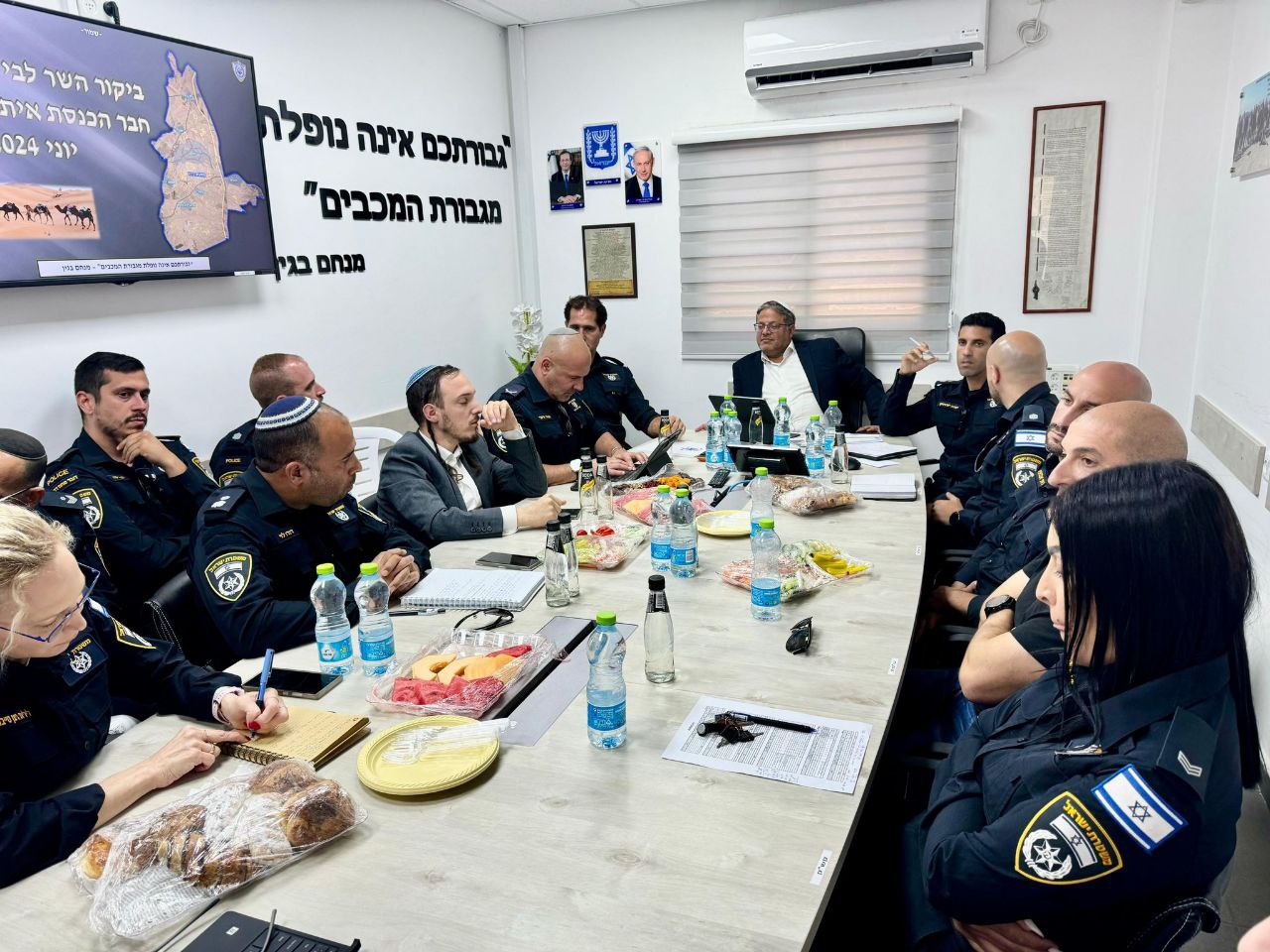 השר לביטחון לאומי איתמר בן גביר בביקור בתחנת משטרת רהט יחד עם ממ"ז דרום ניצב אמיר כהן