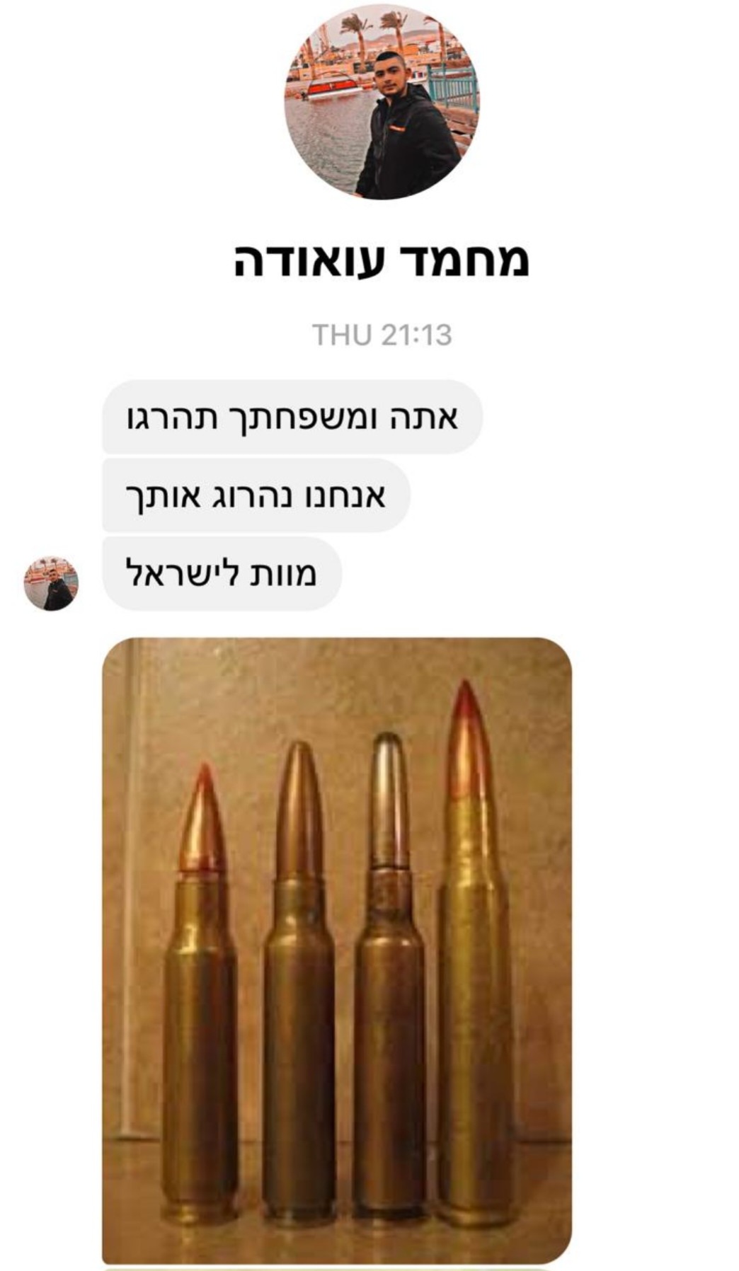 איומים על חייו של יו"ר עוצמה יהודית ח"כ איתמר בן גביר נשלחו בפייסבוק. בהודעת האיום שנשלחה תמונת כדורי רובה וכיתוב "אתה ובני משפחתך תהרגו, אנחנו נהרוג אותך".